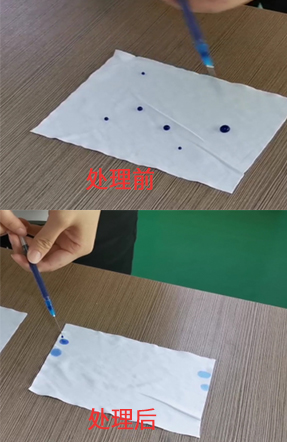 將等離子體清洗機處理后無塵布,平鋪在桌上,再次將藍色透明試劑液注射在無塵布上,這時的試劑液能夠在PET無塵布上迅速鋪展開來,此時PET無塵布的吸水性較等離子表面處理前有了明顯的提升。